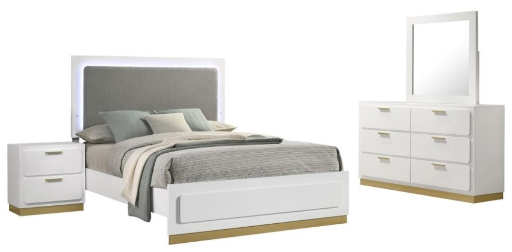 Upholstered headboard with touch LED lighting highlights a four-piece bedroom set